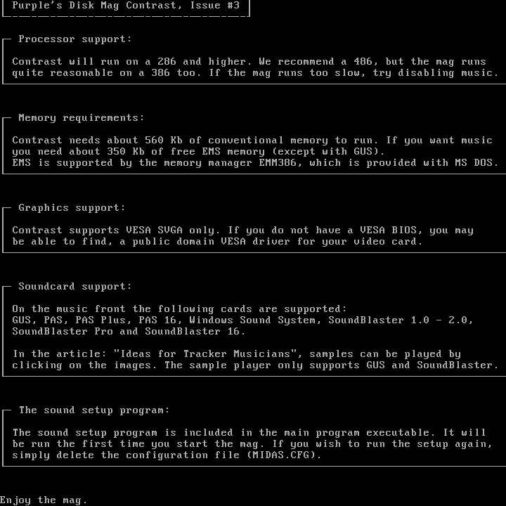 Contrast will run on a 286 and higher. We recommend a 486, but the mag runs
