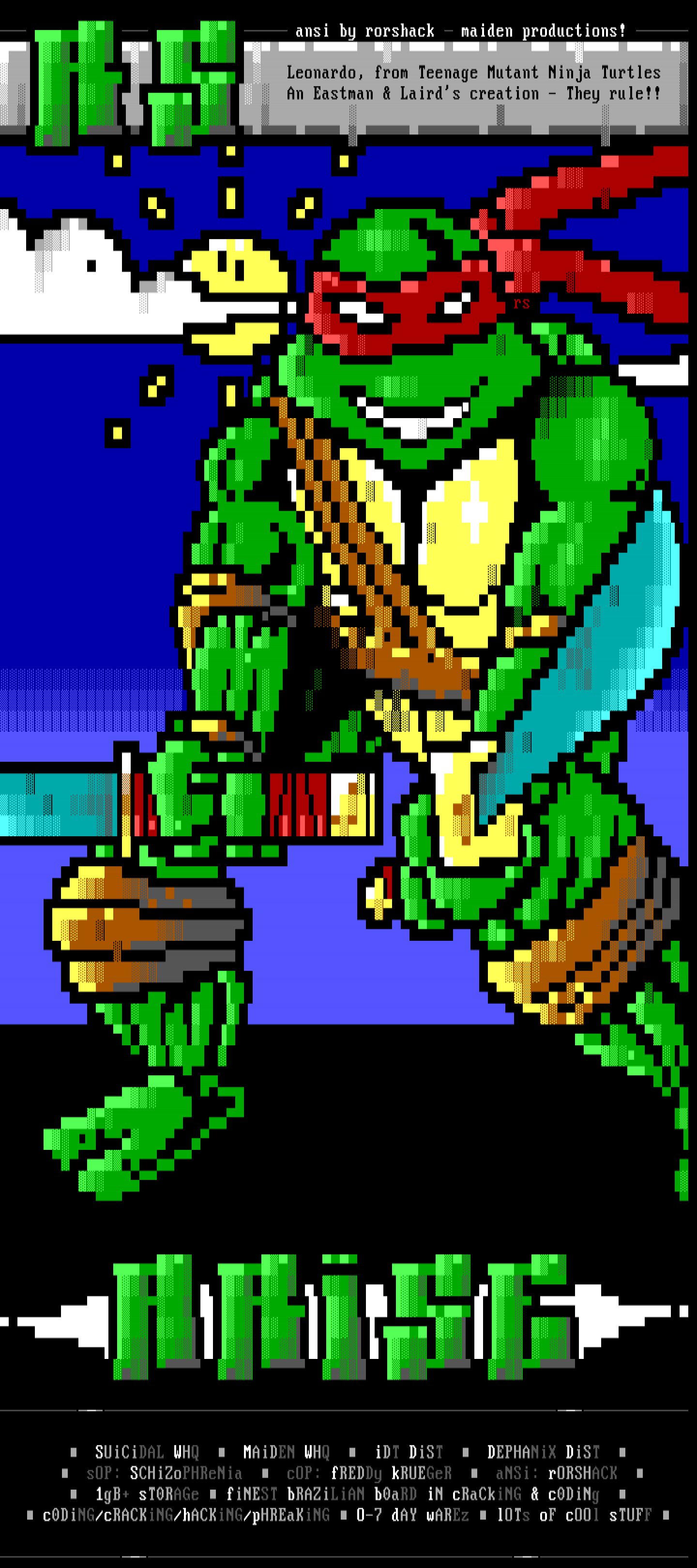COMNTLike, this ansi really kicks ass. The problem is the background - its really a shit! : SAUCE00arise mutant ninja turtl3s r0rshack Maiden Productions 19961027V?