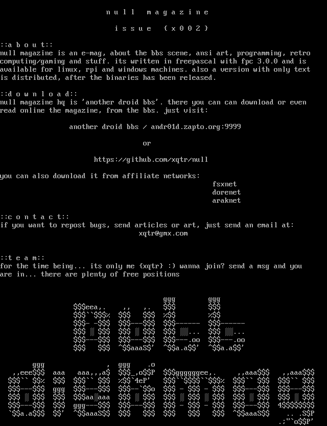 null magazine is an e-mag, about the bbs scene, ansi art, programming, retro