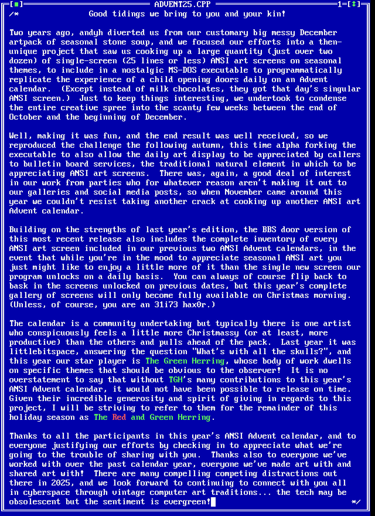 ANSI art screen included in our previous two ANSI Advent calendars, in the