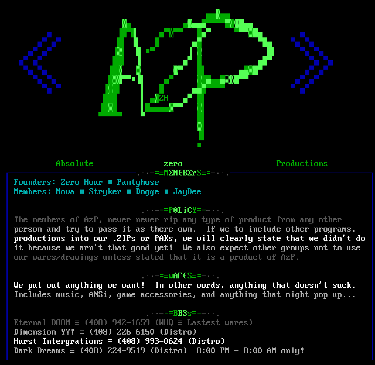 .-MMBrS-. Founders: Zero Hour Pantyhose Members: Nova Stryker Dogge JayDee .-P0LiCY-. The members of AzP, never never rip any type of product from any other person and try to pass it as there own. If we to include other programs, productions into our .ZIPs or PAKs, we will clearly state that we didnt do it because we arnt that good yet! We also expect other groups not to use our wares/drawings unless stated that it is a product of AzP. .-wAS-. We put out anything we want! In other words, anything that doesnt suck. Includes music, ANSi, game accessories, and anything that might pop up... .-BBSs-. Eternal DOOM 408 942-1659 WHQ Lastest wares Dimension Y?! 408 226-6150 Distro Hurst Intergrations 408 993-0624 Distro Dark Dreams 408 224-9519 Distro 8:00 PM - 8:00 AM only!