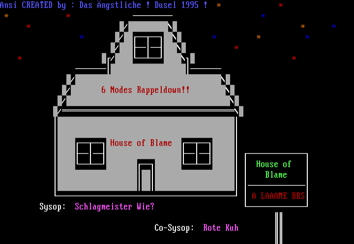Ansi CREATED by : Das ngstliche ! Dusel 1995 ! * * * * * * / * * * / * * * / * * / * / / 6 Nodes Rappeldown!! / / House of Blame House of Blame
