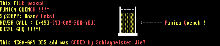 This MEGA-GAY BBS add was CODED by Schlagmeister Wie?