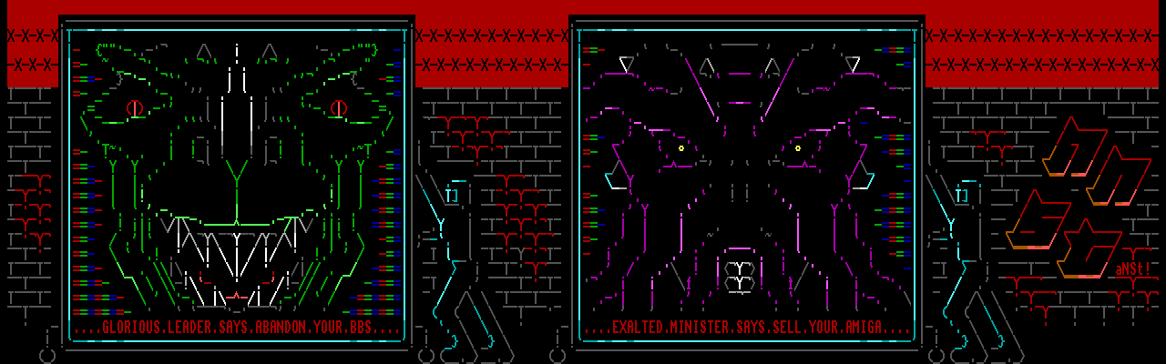 .-....GLORIOUS.LEADER.SAYS.ABANDON.YOUR.BBS....-. . .-....EXALTED.MINISTER.SAYS.SELL.YOUR.AMIGA....-. .