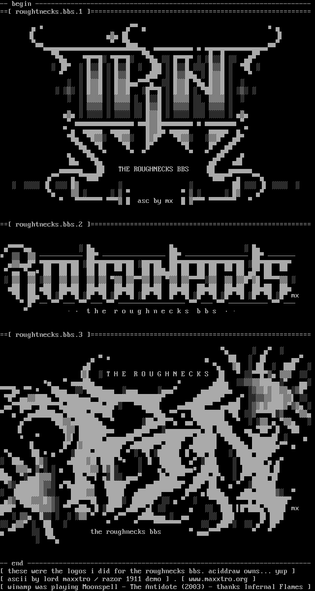 these were the logos i did for the roughnecks bbs. aciddraw owns... yup