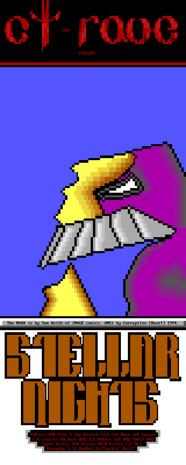 The MAXX is by Sam Keithof iMAGE comics. ANSiby Corruption Rave! 1994. TSN6io-896-9i4oS:The WizardiCECiARaveSoPLapse CiA Courier HQRave WHQiCE MemberSoP WHQPHAiT WHQ Lapse DistroVoR DistroRAiN DistroCiP Net Renegade 5-31 Modded To Phuckin Hell!