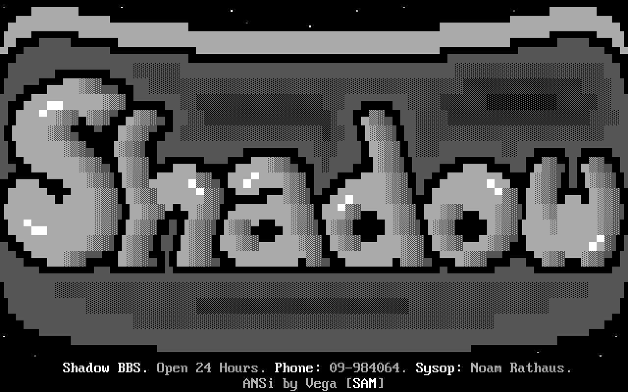 . . Shadow BBS. Open 24 Hours. Phone: 09-984064. Sysop: Noam Ratha