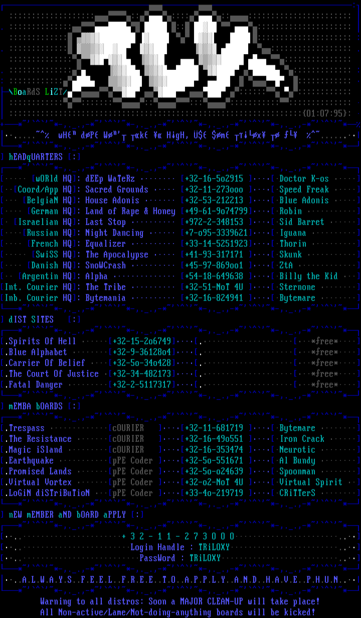 **-,..,-**-,..,-**-,..,-**-,..,-**..+ 3 2 - 1 1 - 2 7 3 O O O....Login Handle : TRiLOXY....PassWord : TRiLOXY..**-,..,-**-,..,-**-,..,-**-,..,-**..A.L.W.A.Y.S..F.E.E.L..F.R.E.E..T.O..A.P.P.L.Y..A.N.D..H.A.V.E..P.H.U.N..**-,..,-**-,..,-**-,..,-**-,..,-** Warning to all distros: Soon a MAJOR CLEAN-UP will take place!