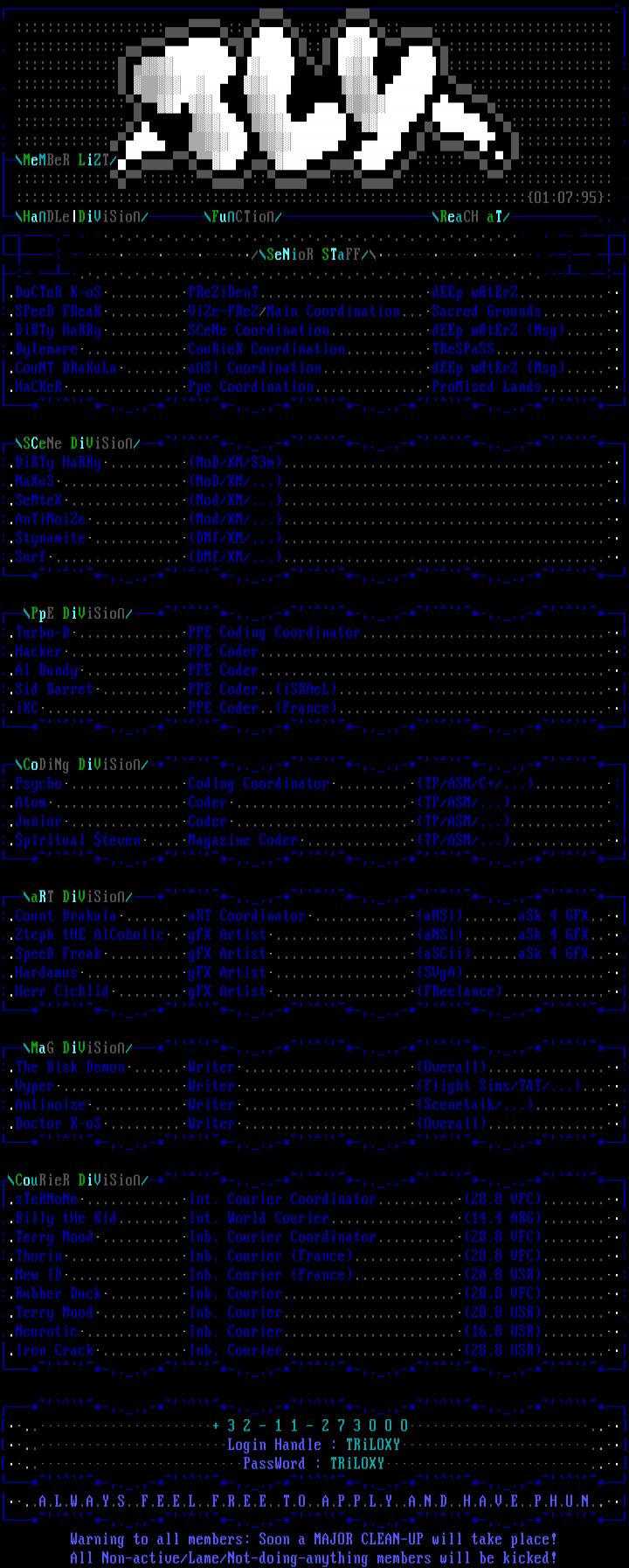 aRT DiViSio/-**-,..,-**-,..,-**-,..,-**:.Count Drakula.......aRT Coordinator............aNSi.......aSk 4 GFX....Zteph tHE AlCoholic.gFX Artist.................aNSi.......aSk 4 GFX.....SpeeD Freak.........gFX Artist.................aSCii......aSk 4 GFX.....Hardamus............gFX Artist.................SVgA..................::.Herr Cichlid........gFX Artist.................FReelance.............**-,..,-**-,..,-**-,..,-**-,..,-**