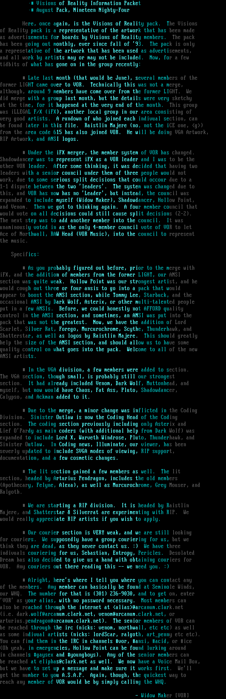 Visions of Reality Information Packet August Pack, Nineteen Nighty-Four Here, once again, is the Visions of R
