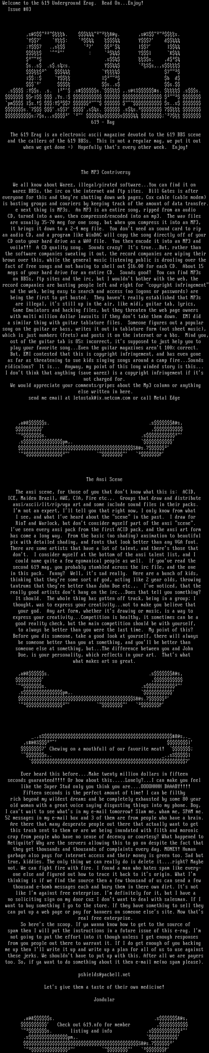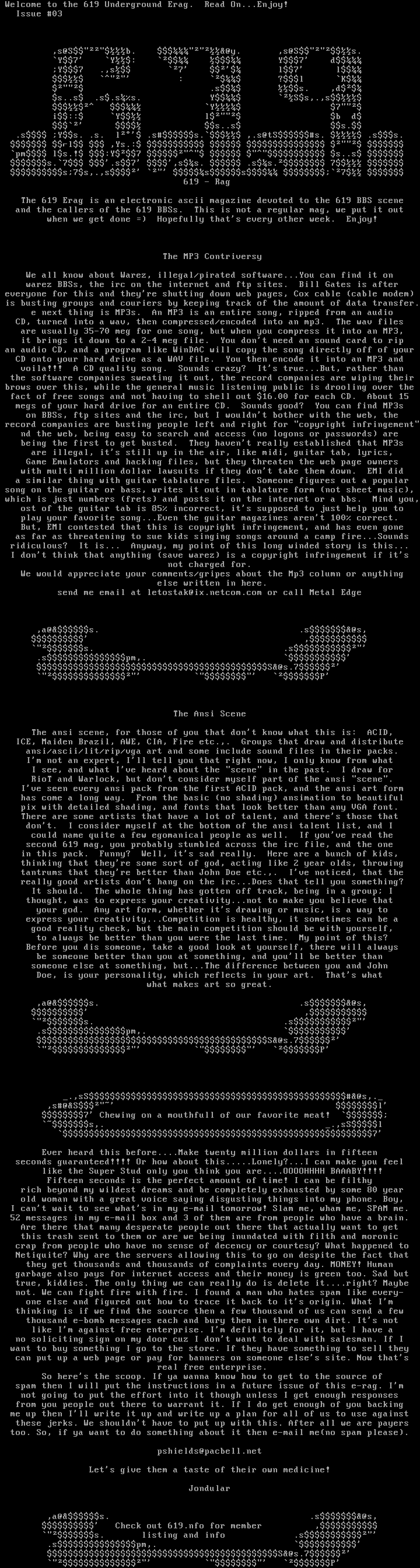 The 619 Erag is an electronic ascii magazine devoted to the 619 BBS scene