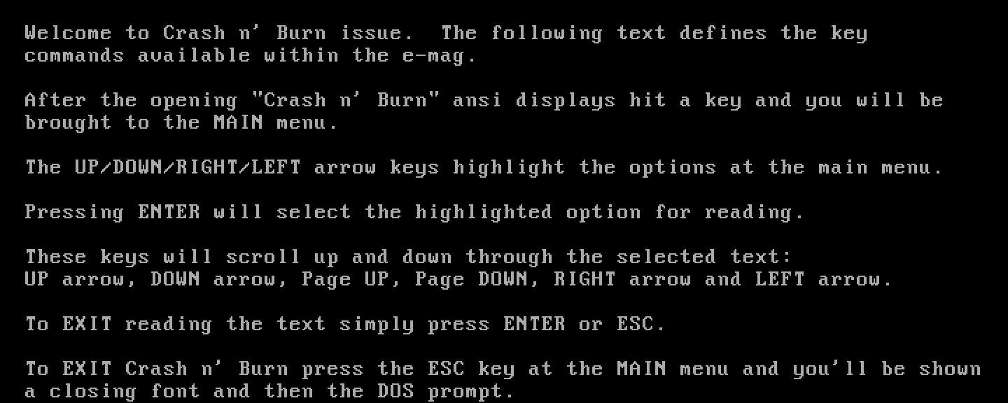 After the opening Crash n Burn ansi displays hit a key and you will be