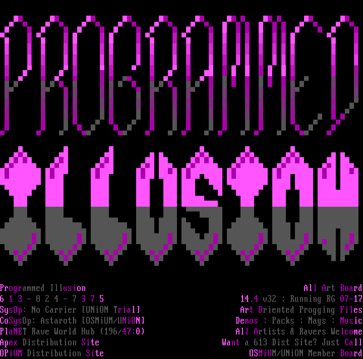 Programmed Illusion All Art Board6 1 3 - 8 2 4 - 7 3 7 5 14.4 v32 : Running RG 07-17SysOp: No Carrier UNiON Trial Art Oriented Progging FilesCoSysOp: Astaroth OSMiUM/UNiON Demos : Packs : Mags : MusicPlaNET Rave World Hub 196/47:0 All Artists Ravers WelcomeApex Distribution Site Want a 613 Dist Site? Just CallOPiUM Distribution Site OSMiUM/UNiON Member Board