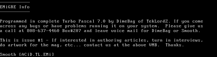 Programmed in complete Turbo Pascal 7.0 by DimeBag of TekLordZ. If you come