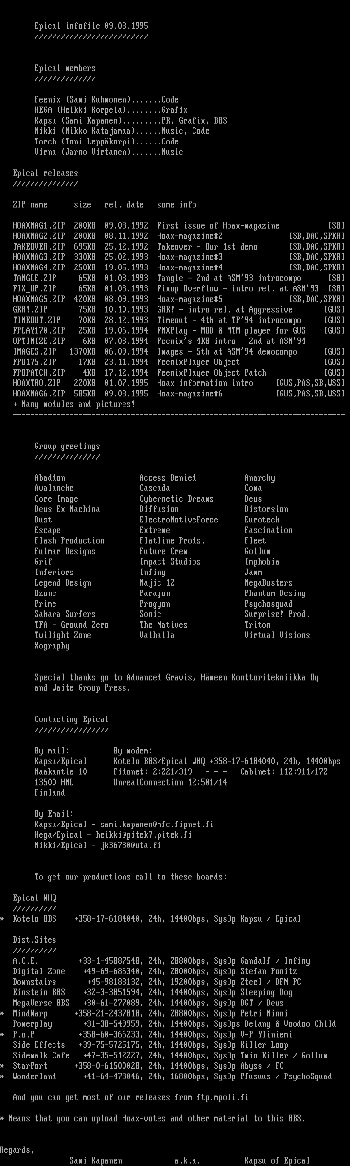 Kapsu/Epical Kotelo BBS/Epical WHQ +358-17-6184040, 24h, 14400bps