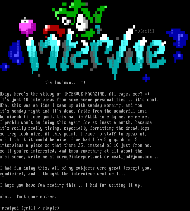 ansi scene, write me at corny@interport.net or meatpod@juno.com...