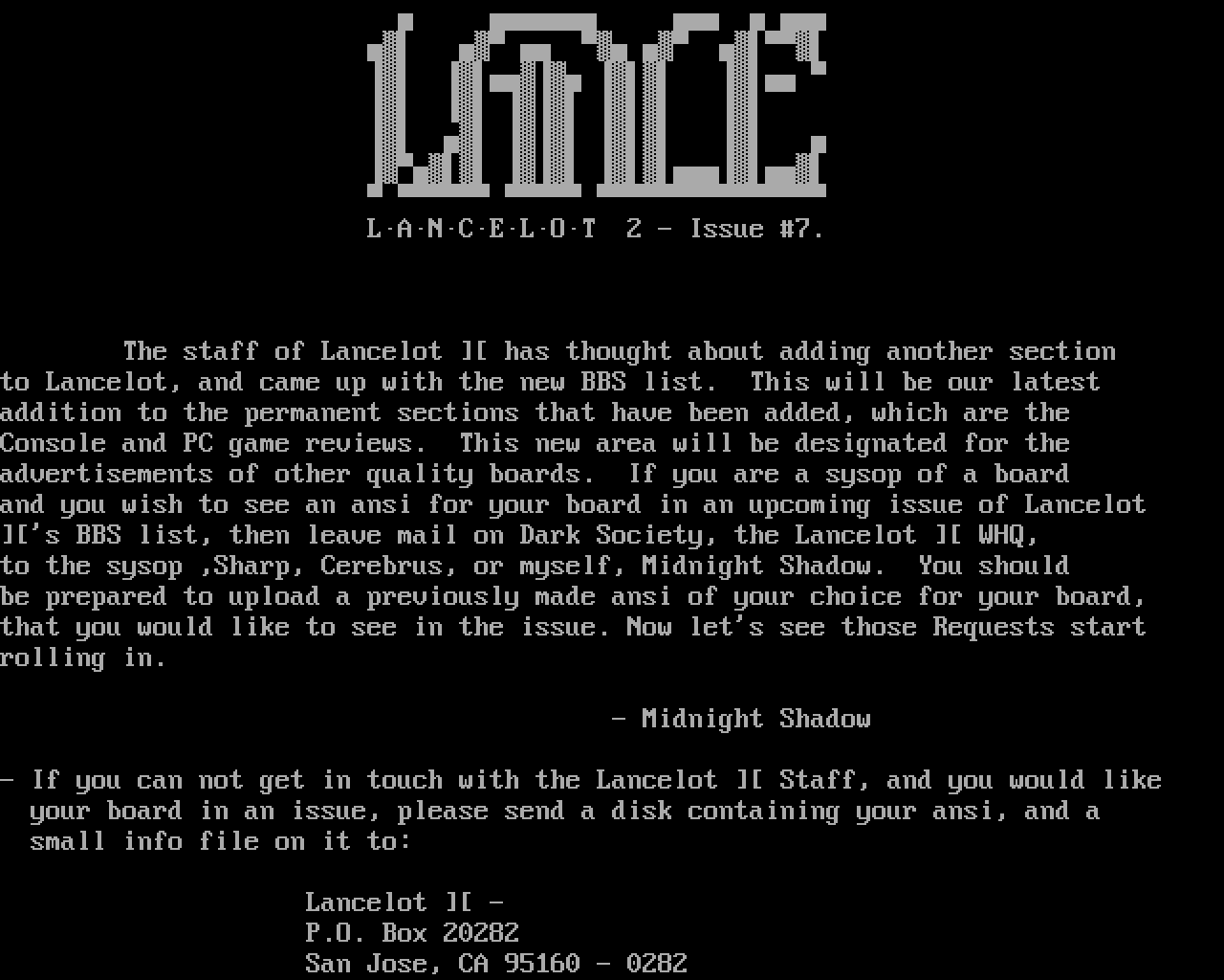 s BBS list, then leave mail on Dark Society, the Lancelot WHQ,