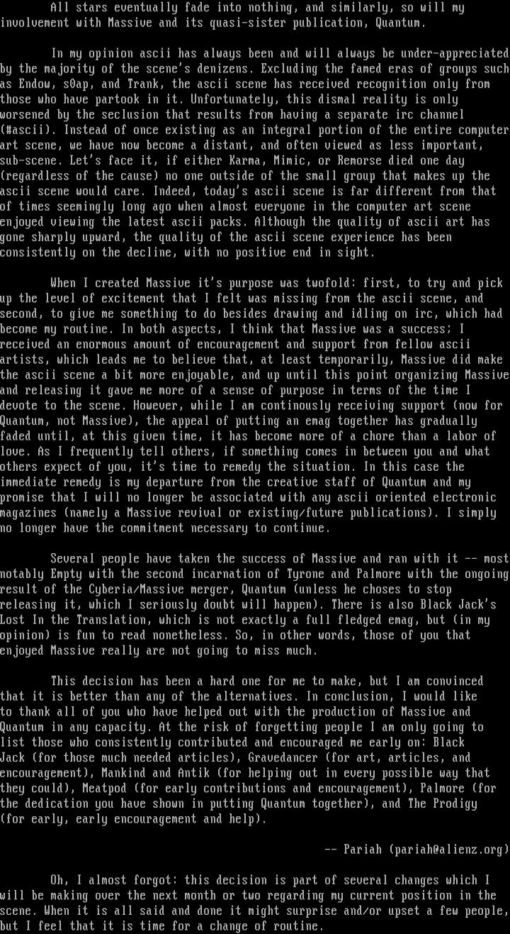 the ascii scene a bit more enjoyable, and up until this point organizing Massiveand releasing it gave me more of a sense of purpose in terms of the time I