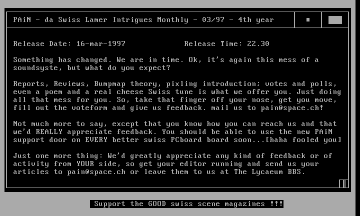 articles to pain@space.ch or leave them to us at The Lycaeum BBS.