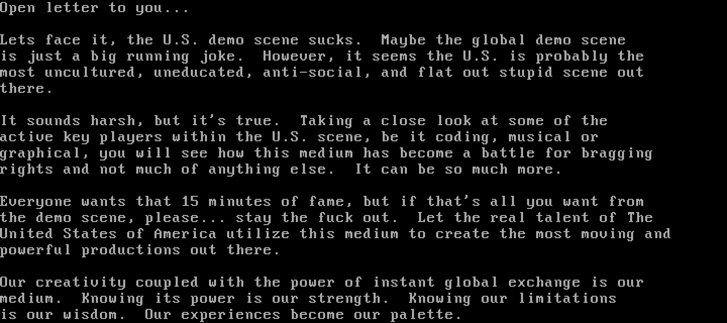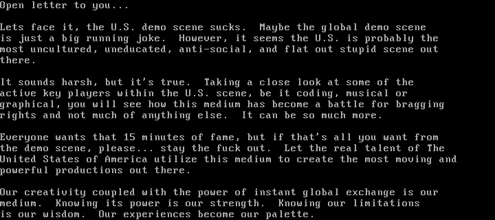 Lets face it, the U.S. demo scene sucks. Maybe the global demo scene