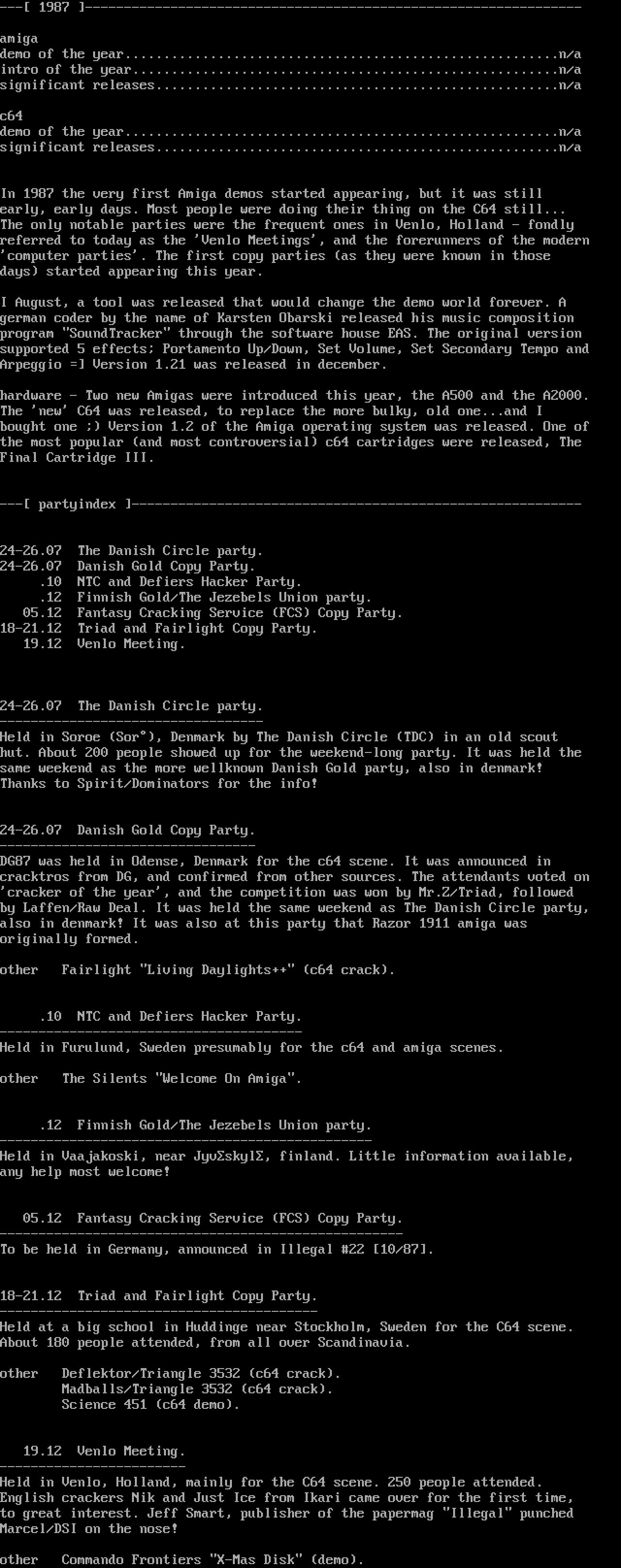 DG87 was held in Odense, Denmark for the c64 scene. It was announced in