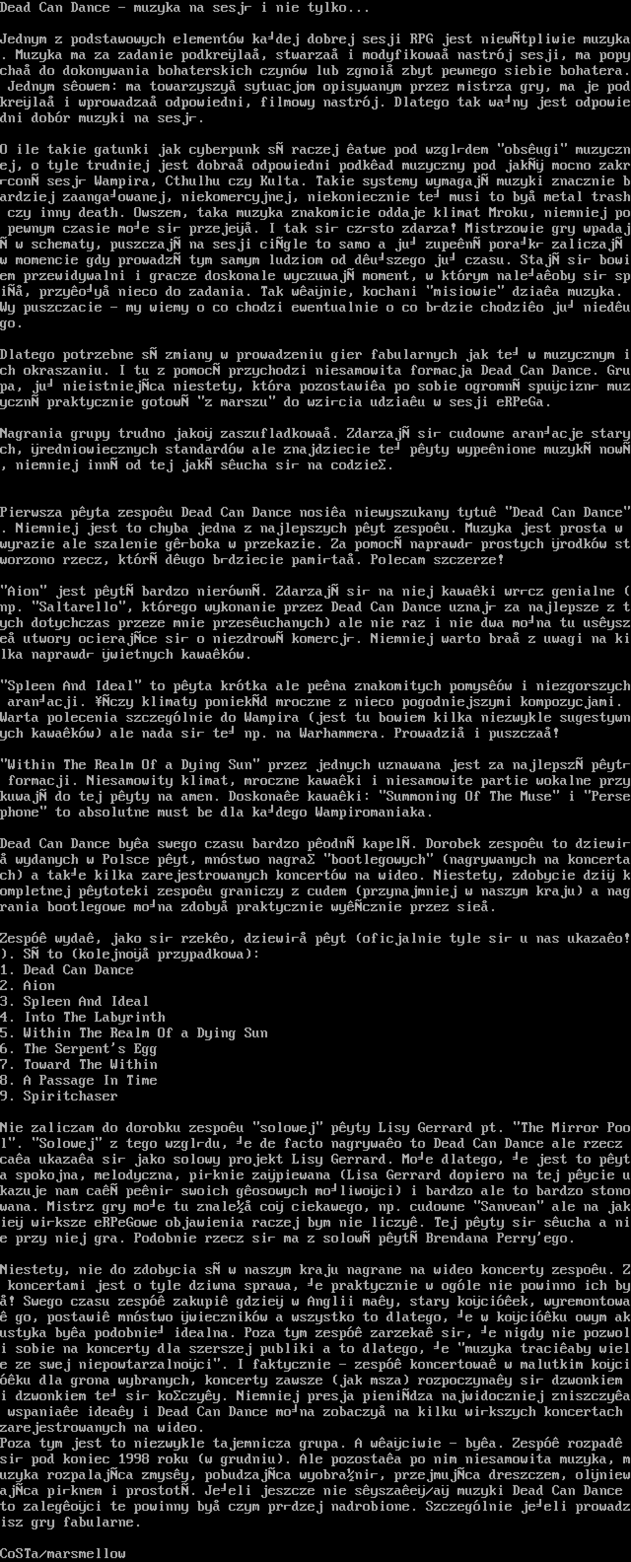Poza tym jest to niezwykle tajemnicza grupa. A waciwie - bya. Zesp rozpad si pod koniec 1998 roku w grudniu. Ale pozostaa po nim niesamowita muzyka, muzyka rozpalajca zmysy, pobudzajca wyobrani, przejmujca dreszczem, olniewajca piknem i prostot. Jeeli jeszcze nie syszae/a muzyki Dead Can Dance to zalegoci te powinny by czym prdzej nadrobione. Szczeglnie jeeli prowadzisz gry fabularne.