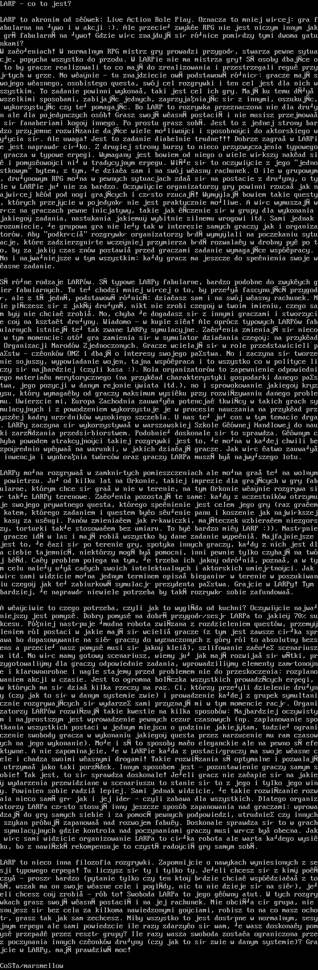 LARP to akronim od swek: Live Action Role Play. Oznacza to mniej wicej: gra fabularna na ywo i w akcji :. Ale przecie zwyke RPG nie jest niczym innym jak gr fabularn na ywo! Gdzie wic znajduj si rnice pomidzy tymi dwoma gatunkami?