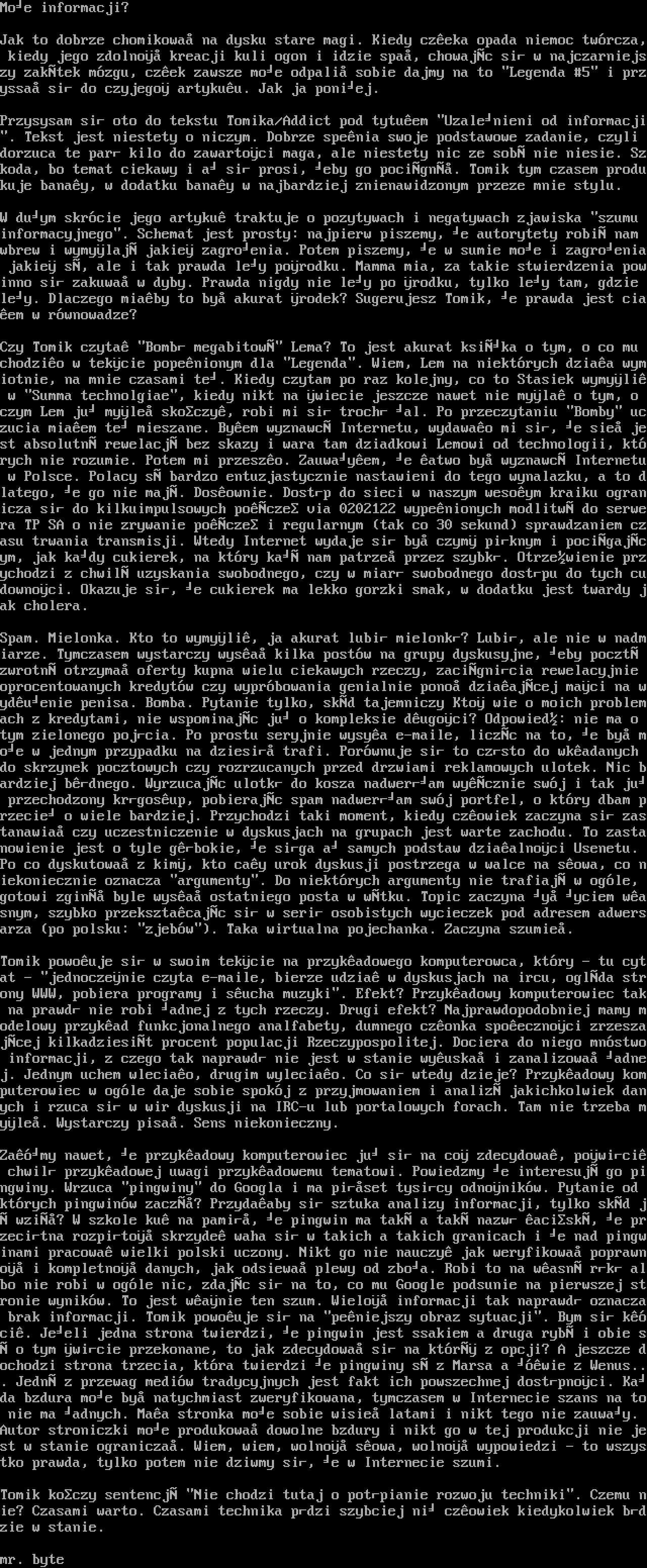 Czy Tomik czyta Bomb megabitow Lema? To jest akurat ksika o tym, o co mu chodzio w tekcie popenionym dla Legenda. Wiem, Lem na niektrych dziaa wymiotnie, na mnie czasami te. Kiedy czytam po raz kolejny, co to Stasiek wymyli w Summa technolgiae, kiedy nikt na wiecie jeszcze nawet nie myla o tym, o czym Lem ju myle skoczy, robi mi si troch al. Po przeczytaniu Bomby uczucia miaem te mieszane. Byem wyznawc Internetu, wydawao mi si, e sie jest absolutn rewelacj bez skazy i wara tam dziadkowi Lemowi od technologii, ktrych nie rozumie. Potem mi przeszo. Zauwayem, e atwo by wyznawc Internetu w Polsce. Polacy s bardzo entuzjastycznie nastawieni do tego wynalazku, a to dlatego, e go nie maj. Dosownie. Dostp do sieci w naszym wesoym kraiku ogranicza si do kilkuimpulsowych pocze via 0202122 wypenionych modlitw do serwera TP SA o nie zrywanie pocze i regularnym tak co 30 sekund sprawdzaniem czasu trwania transmisji. Wtedy Internet wydaje si by czym piknym i pocigajcym, jak kady cukierek, na ktry ka nam patrze przez szybk. Otrzewienie przychodzi z chwil uzyskania swobodnego, czy w miar swobodnego dostpu do tych cudownoci. Okazuje si, e cukierek ma lekko gorzki smak, w dodatku jest twardy jak cholera.