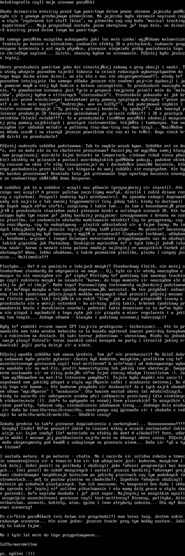 I nastaa matura. A po maturze - studia. No i zacza si solidna robota w temacie samookrelenia si w temacie kim si tak waciwie jest: koderem, muzykiem i tak dalej. Jedni poszli na polibudy i skoczyli jako aosni programici baz danych... Inni poszli do szk muzycznych i zostali jeszcze bardziej aosnymi grajkami chodnikowymi wspczuje kolesiom po jakich pianinach czy tym podobnych instrumentach... we tu postaw pianino na chodniku!. Zupenie aonie skoczyli kolesie po szkoach plastycznych. Tam ich nauczono, e bazgranie bez adu i skadu sprzeda si lepiej ni solidne pikselowanie i oto mamy dzi prace w stylu skan panienki, duo napisw dookoa i ju jest super. Najlepiej na wszystkim wyszli oczywicie wszechstronni geniusze czyli text-writterzy! Biznesy, polityka, dziennikarstwo, uznanie, kobiety, wino, piew i inne atrybuty sukcesu... Oto my! Wzorowi scenerzy!