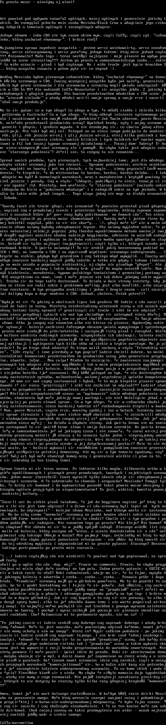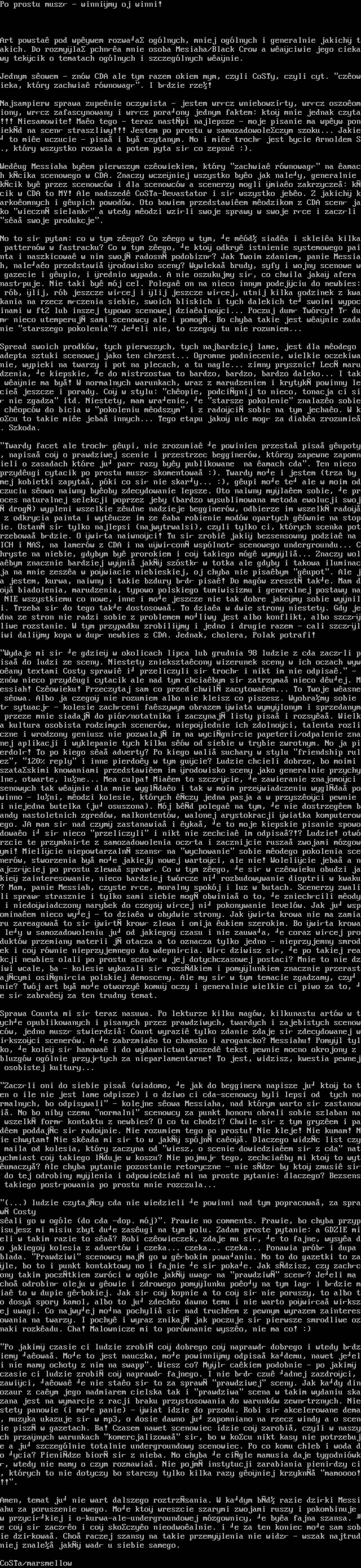 Wydaje mi si e gdzie w okolicach lipca lub grudnia 98 ludzie z cda zaczli pisa do ludzi ze sceny. Niestety znieksztacony wizerunek sceny w ich oczach wywoany textami Costy sprawi i przeliczyli si troch i nikt im nie odpisa. - znw nieco przydugi cytacik ale nad tym chciabym si zatrzyma nieco duej. Messiah! Czowieku! Przeczytaj sam co przed chwil zacytowaem... To Twoje wasne sowa. Albo ja czego nie rozumiem albo nie kleisz co piszesz. Wyobramy sobie t sytuacj - kolesie zachceni faszywym obrazem wiata wymylonym i sprzedanym przeze mnie siadaj do pir/notatnika i zaczynaj listy pisa i rozsya. Wielka kultura osobista rodzimych scenerw, niepolednie ich zdolnoci, talenta rozliczne i wrodzony geniusz nie pozwalaj im na wycignicie papeterii/odpalenie znanej aplikacji i wyklepanie tych kilku sw od siebie w trybie zwrotnym. No ja pierdol! To po kiego sa adverty? Po kiego wali suchary w stylu friendship rulez, 120 reply i inne pierdoy w tym gucie? Ludzie chcieli dobrze, bo moimi szataskimi knowaniami przedstawiem im rodowisko sceny jako generalnie przychylne, otwarte, lune... Mea culpa! Miaem to szczcie, e zawieranie znajomoci senowych tak wanie dla mnie wygldao i tak w moim przewiadczeniu wyglda powinno - luni, modzi kolesie, ktrych czy jedna pasja a w przyszoci pewnie i niejedna butelka ju osuszona. Mj bd polega na tym, e nie dostrzegem bandy nastoletnich zgredw, malkontentw, walonej arystokracji wiatka komputerowego. JA mam si nad czym zastanawia i yka, e to moje kiepskie pisanie spowodowao i si nieco przeliczyli i nikt nie zechcia im odpisa?!? Ludzie! otwrzcie te przymknite z samozadowolenia oczta i zacznijcie rusza zwojami mzgowymi! Mielicie niepowtarzaln szans na wychowanie sobie modego pokolenia scenerw, stworzenia by moe jakiej nowej wartoci, ale nie! Wolelicie jeba a najczciej po prostu zlewa spraw. Co w tym zego, e si w czowieku obudzi jakie zainteresowanie, nieco bardziej twrcze ni rozbudowywanie dioptrii w kwaku? Mam, panie Messiah, czyste rce, moralny spokj i luz w butach. Scenerzy zwalili spraw strasznie i tylko sami siebie mog obwinia o to, e zniechcili mody i niedowiadczony narybek do czego wicej ni pokonywanie levelw. Jak ju wspominaem nieco wyej - to dziaa w obydwie strony. Jak wita krowa nie ma zamiaru zareagowa to si wit krow zlewa i omija ukiem szerokim. Bo wita krowa ley w samozadowoleniu ju od jakiego czasu i nie zauwaa, e coraz wicej produktw przemiany materii j otacza a to oznacza tylko jedno - nieprzyjemny smrodek i co rwnie nieprzyjemnego do wdepnicia. Wic dziwisz si, e po takiej reakcji newbies olali po prostu scenk w jej dotychczasowej postaci? Mnie to nie dziwi wcale, ba - kolesie wykazali si rozsdkiem i pomylunkiem znacznie przerastajcymi osignicia polskiej demosceny. Ale my si w tym temacie zgadzamy, czy nie? Twj art by moe otworzy komu oczy i generalnie wielkie ci piwo za to, e si zabrae za ten trudny temat.