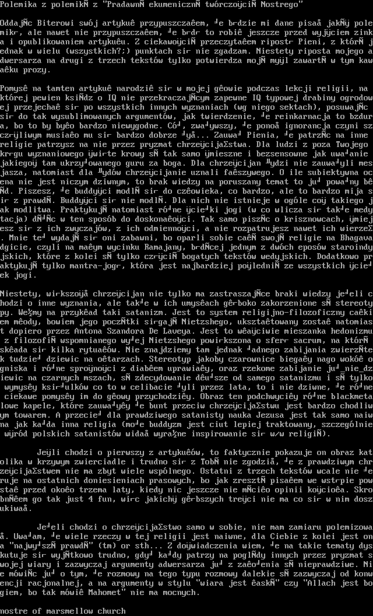 Jeli chodzi o pierwszy z artykuw, to faktycznie pokazuje on obraz katolika w krzywym zwierciadle i trudno si z Tob nie zgodzi, e z prawdziwym chrzecijastwem nie ma zbyt wiele wsplnego. Ostatni z trzech tekstw wcale nie eruje na ostatnich doniesieniach prasowych, bo jak zreszt pisaem we wstpie powsta przed okoo trzema laty, kiedy nic jeszcze nie mcio opinii kocioa. Skrobnem go tak just 4 fun, wic jakich gbszych treci nie ma co si w nim doszukiwa.