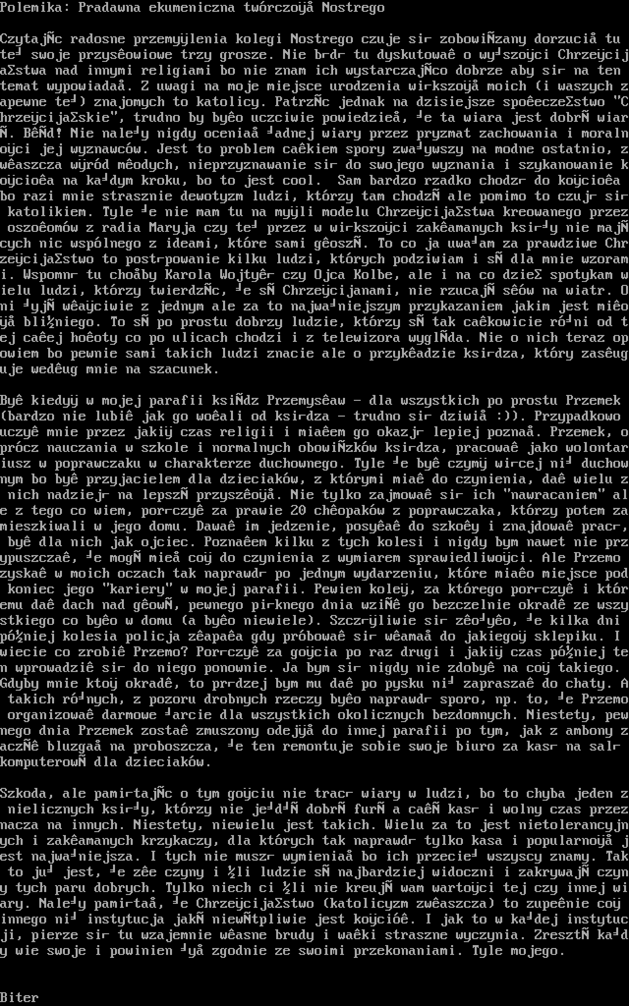 Szkoda, ale pamitajc o tym gociu nie trac wiary w ludzi, bo to chyba jeden z nielicznych ksiy, ktrzy nie jed dobr fur a ca kas i wolny czas przeznacza na innych. Niestety, niewielu jest takich. Wielu za to jest nietolerancyjnych i zakamanych krzykaczy, dla ktrych tak naprawd tylko kasa i popularno jest najwaniejsza. I tych nie musz wymienia bo ich przecie wszyscy znamy. Tak to ju jest, e ze czyny i li ludzie s najbardziej widoczni i zakrywaj czyny tych paru dobrych. Tylko niech ci li nie kreuj wam wartoci tej czy innej wiary. Naley pamita, e Chrzecijastwo katolicyzm zwaszcza to zupenie co innego ni instytucja jak niewtpliwie jest koci. I jak to w kadej instytucji, pierze si tu wzajemnie wasne brudy i waki straszne wyczynia. Zreszt kady wie swoje i powinien y zgodnie ze swoimi przekonaniami. Tyle mojego.