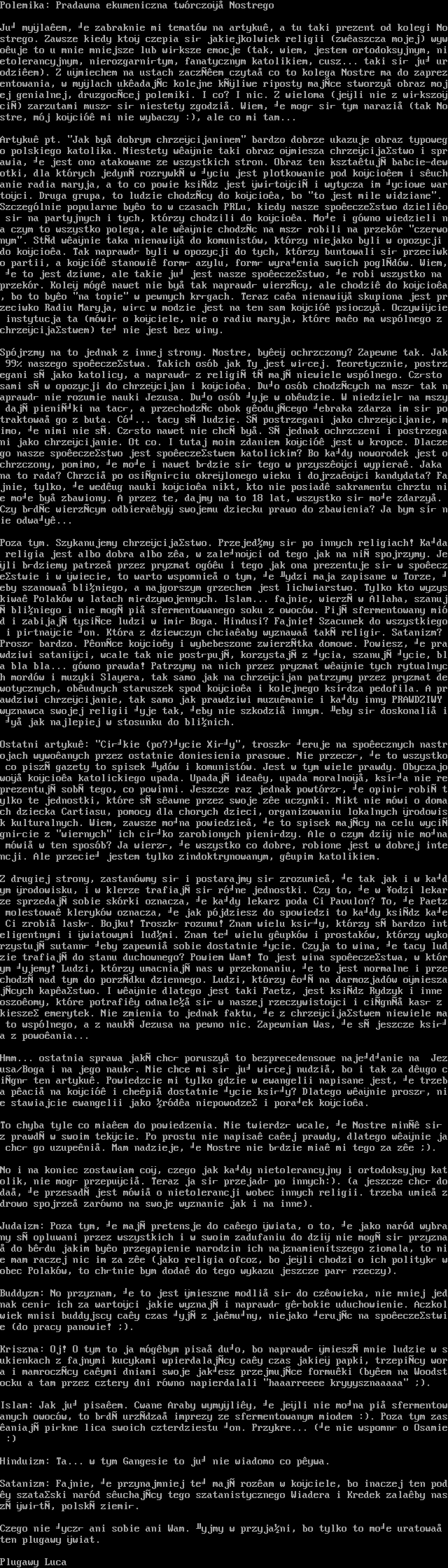 No i na koniec zostawiam co, czego jak kady nietolerancyjny i ortodoksyjny katolik, nie mog przepuci. Teraz ja si przejad po innych:. a jeszcze chc doda, e przesad jest mwi o nietolerancji wobec innych religii. trzeba umie zdrowo spojrze zarwno na swoje wyznanie jak i na inne.