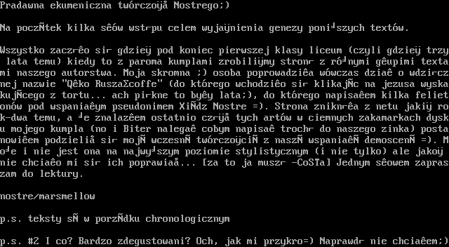 Wszystko zaczo si gdzie pod koniec pierwszej klasy liceum czyli gdzie trzy lata temu kiedy to z paroma kumplami zrobilimy stron z rnymi gupimi textami naszego autorstwa. Moja skromna osoba poprowadzia wwczas dzia o wdzicznej nazwie Qko Ruszacoffe do ktrego wchodzio si klikajc na jezusa wyskakujcego z tortu... ach pikne to byy lata, do ktrego napisaem kilka felietonw pod wspaniaym pseudonimem Xidz Nostre . Strona znikna z netu jaki rok-dwa temu, a e znalazem ostatnio cz tych artw w ciemnych zakamarkach dysku mojego kumpla no i Biter nalega cobym napisa troch do naszego zinka postanowiem podzieli si moj wczesn twrczoci z nasz wspania demoscen . Moe i nie jest ona na najwyszym poziomie stylistycznym i nie tylko ale jako nie chciao mi si ich poprawia... za to ja musz -CoSTa Jednym sowem zapraszam do lektury.
