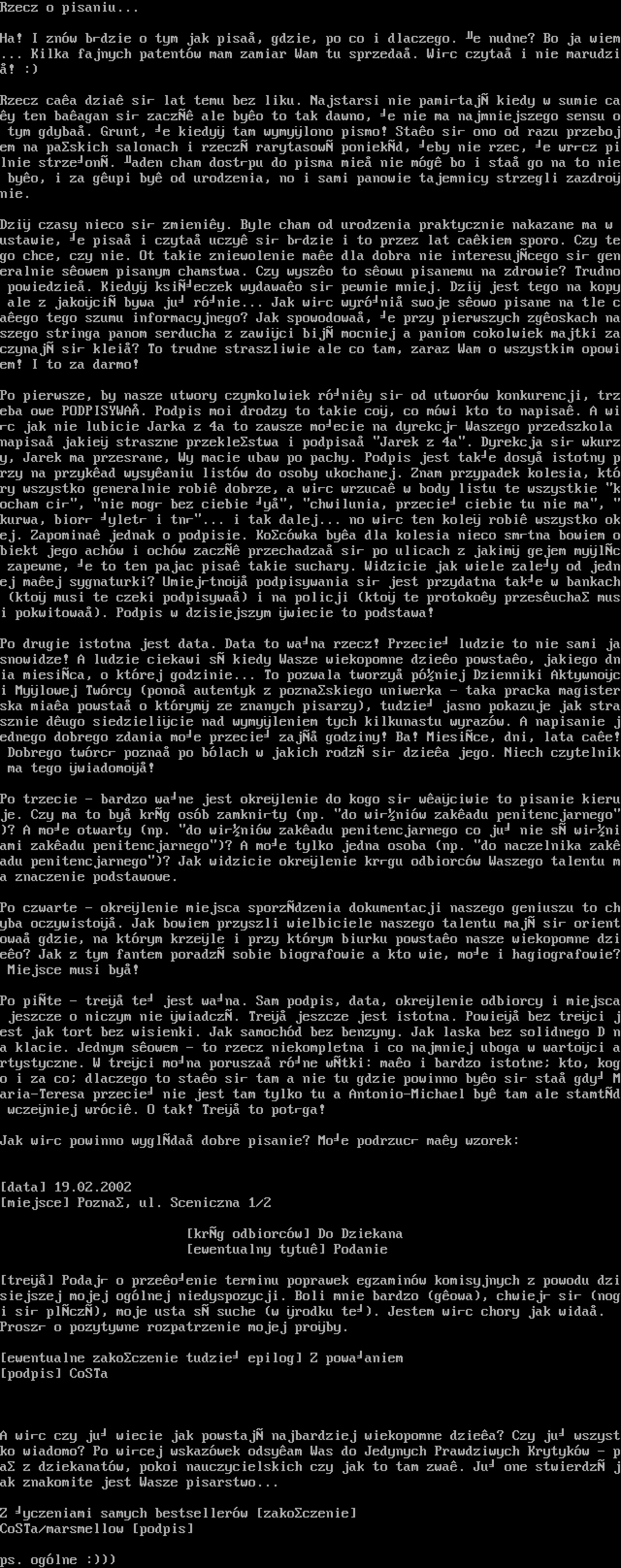 Po pierwsze, by nasze utwory czymkolwiek rniy si od utworw konkurencji, trzeba owe PODPISYWA. Podpis moi drodzy to takie co, co mwi kto to napisa. A wic jak nie lubicie Jarka z 4a to zawsze moecie na dyrekcj Waszego przedszkola napisa jakie straszne przeklestwa i podpisa Jarek z 4a. Dyrekcja si wkurzy, Jarek ma przesrane, Wy macie ubaw po pachy. Podpis jest take dosy istotny przy na przykad wysyaniu listw do osoby ukochanej. Znam przypadek kolesia, ktry wszystko generalnie robi dobrze, a wic wrzuca w body listu te wszystkie kocham ci, nie mog bez ciebie y, chwilunia, przecie ciebie tu nie ma, kurwa, bior ylet i tn... i tak dalej... no wic ten kole robi wszystko okej. Zapomina jednak o podpisie. Kocwka bya dla kolesia nieco smtna bowiem obiekt jego achw i ochw zacz przechadza si po ulicach z jakim gejem mylc zapewne, e to ten pajac pisa takie suchary. Widzicie jak wiele zaley od jednej maej sygnaturki? Umiejtno podpisywania si jest przydatna take w bankach kto musi te czeki podpisywa i na policji kto te protokoy przesucha musi pokwitowa. Podpis w dzisiejszym wiecie to podstawa!