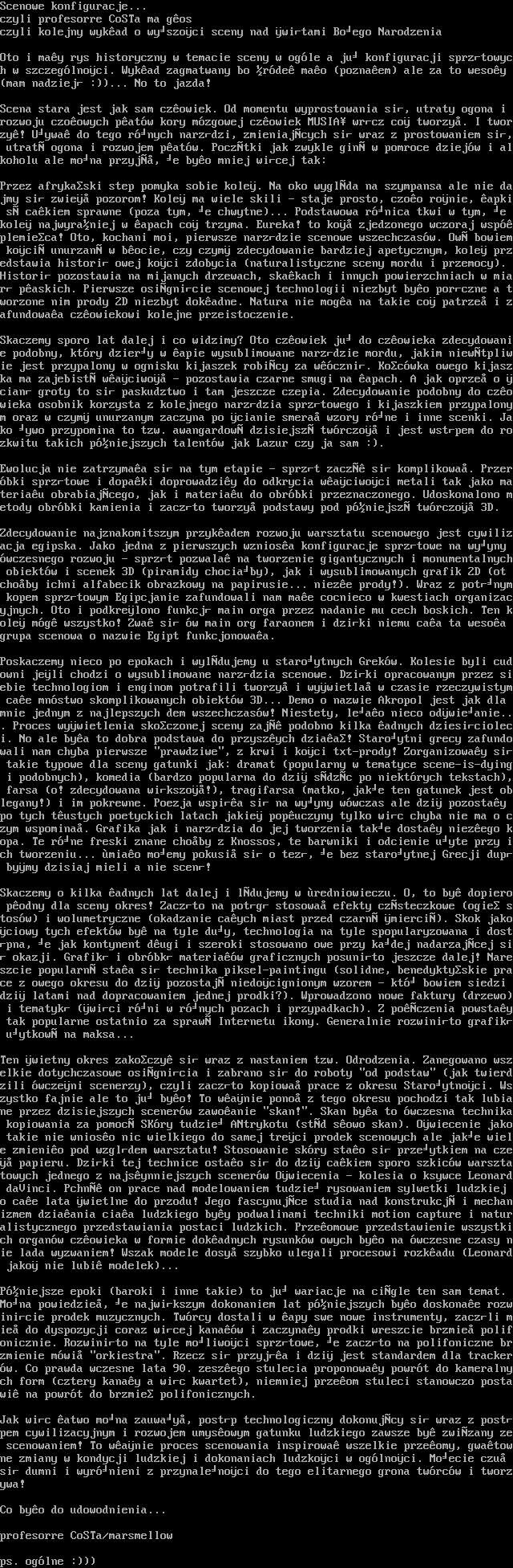 Poskaczemy nieco po epokach i wyldujemy u staroytnych Grekw. Kolesie byli cudowni jeli chodzi o wysublimowane narzdzia scenowe. Dziki opracowanym przez siebie technologiom i enginom potrafili tworzy i wywietla w czasie rzeczywistym cae mnstwo skomplikowanych obiektw 3D... Demo o nazwie Akropol jest jak dla mnie jednym z najlepszych dem wszechczasw! Niestety, leao nieco odwieanie... Proces wywietlenia skoczonej sceny zaj podobno kilka adnych dziesicioleci. No ale bya to dobra podstawa do przyszych dziaa! Staroytni grecy zafundowali nam chyba pierwsze prawdziwe, z krwi i koci txt-prody! Zorganizoway si takie typowe dla sceny gatunki jak: dramat popularny w tematyce scene-is-dying i podobnych, komedia bardzo popularna do dzi sdzc po niektrych tekstach, farsa o! zdecydowana wikszo!, tragifarsa matko, jake ten gatunek jest oblegany! i im pokrewne. Poezja wspia si na wyyny wwczas ale dzi pozostay po tych tustych poetyckich latach jakie popuczyny tylko wic chyba nie ma o czym wspomina. Grafika jak i narzdzia do jej tworzenia take dostay niezego kopa. Te rne freski znane choby z Knossos, te barwniki i odcienie uyte przy ich tworzeniu... miao moemy pokusi si o tez, e bez staroytnej Grecji dup bymy dzisiaj mieli a nie scen!