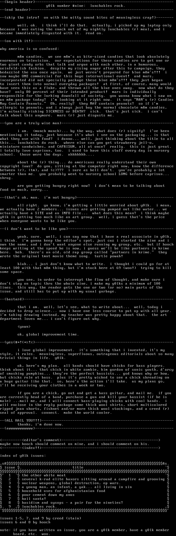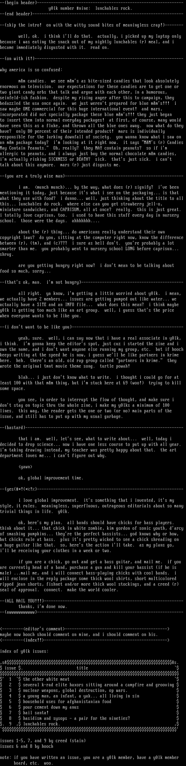 dont stay on topic thru the whole zine, i make my y0lks a minimum of 100