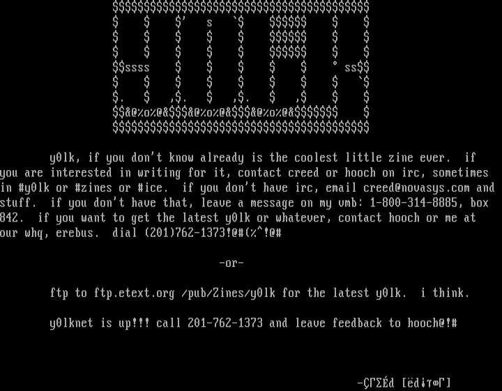 ftp to ftp.etext.org /pub/Zines/y0lk for the latest y0lk. i think.