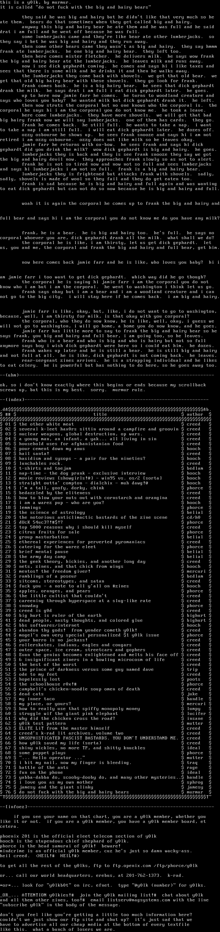 to get all the rest of the y0lks, ftp to ftp.openix.com /ftp/phorce/y0lk