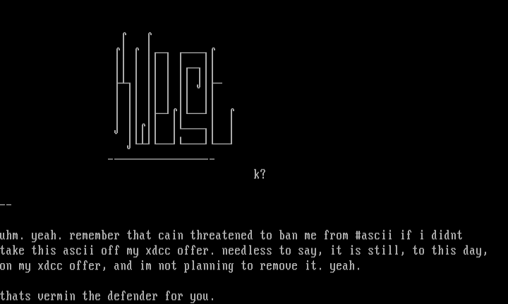 take this ascii off my xdcc offer. needless to say, it is still, to this day,