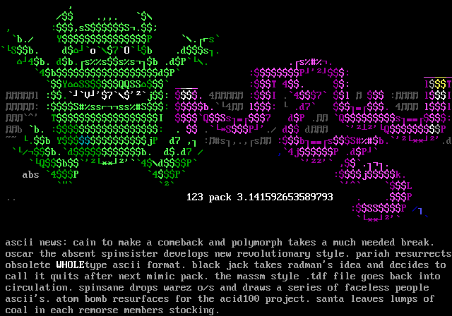 asciis. atom bomb resurfaces for the acid100 project. santa leaves lumps of