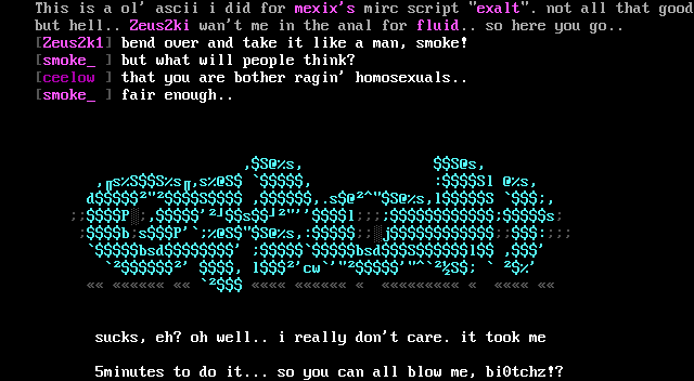This is a ol ascii i did for mexixs mirc script exalt. not all that good but hell.. Zeus2ki want me in the anal for fluid.. so here you go..