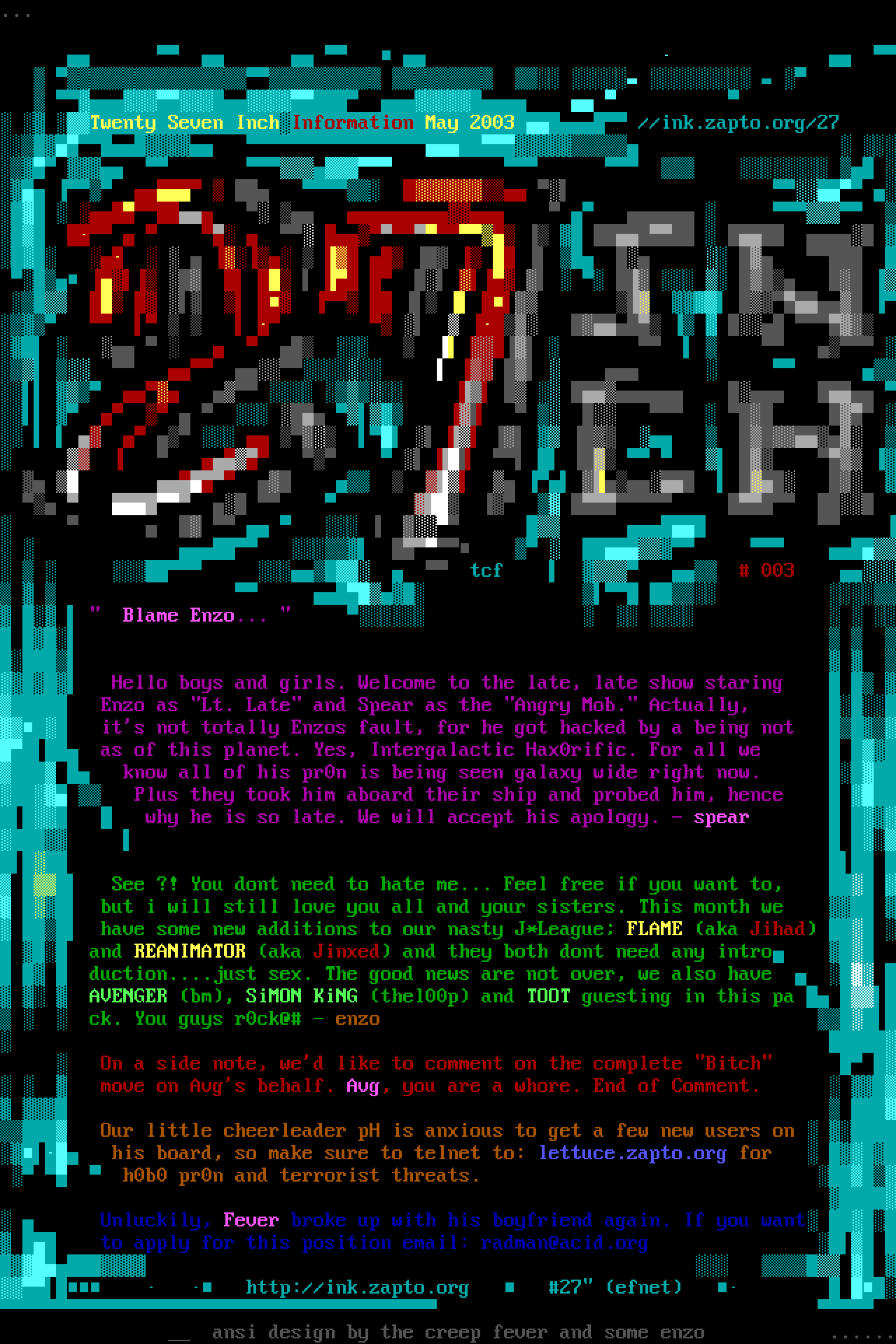 tcf 003 Blame Enzo... Hello boys and girls. Welcome to the late, late show staring Enzo as Lt. Late and Spear as the Angry Mob. Actually, its not totally Enzos fault, for he got hacked by a being not as of this planet. Yes, Intergalactic Hax0rific. For all we know all of his pr0n is being seen galaxy wide right now. Plus they took him aboard their ship and probed him, hence why he is so late. We will accept his apology. - spear See ?! You dont need to hate me... Feel free if you want to, but i will still love you all and your sisters. This month we have some new additions to our nasty J*League FLAME aka Jihad and REANIMATOR aka Jinxed and they both dont need any intro
