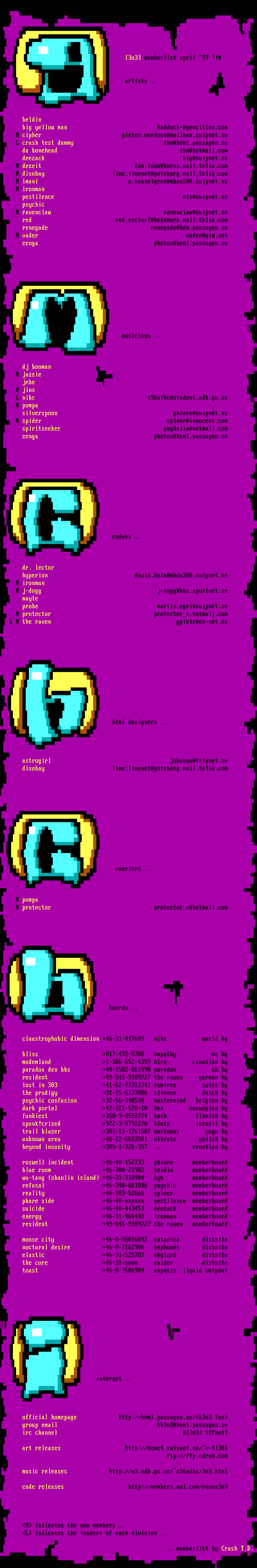 3o3memberlist april 97 !!@ artists .. beldin big yellow man haddock-@geocities.com N cipher pieter.verdoes@mailbox.swipnet.se