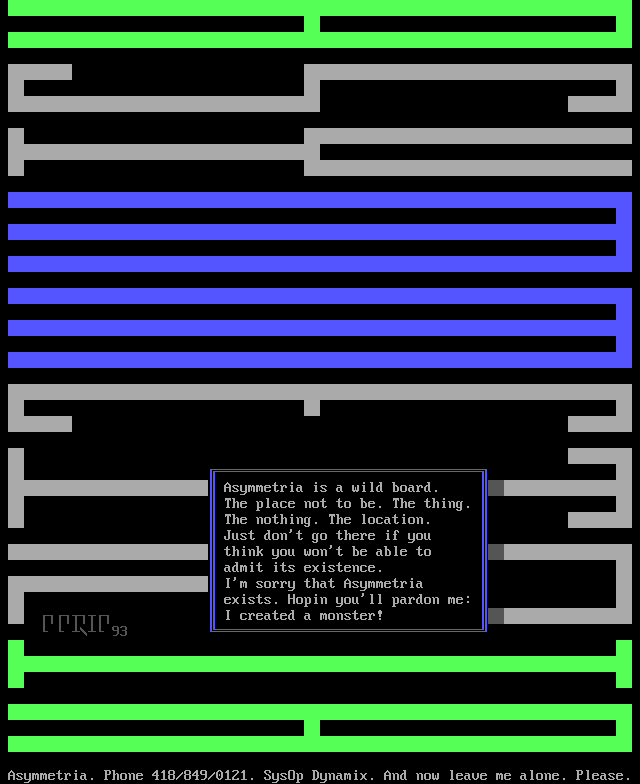 Asymmetria. Phone 418/849/0121. SysOp Dynamix. And now leave me alone. Please.