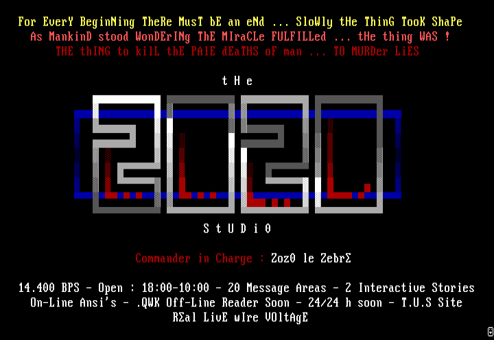 14.400 BPS - Open : 18:00-10:00 - 20 Message Areas - 2 Interactive Stories