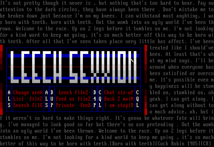 Its not pretty though it never is , but nothing thats too hard to bear. Pay noattention to the dark circles, they have always been there . Dont mistake me tobe broken down just because Im on my knees. I can withstand most anyhting, I was born with teeth, born with teeth. Out the womb into an ugly world Ive been thrown. Welcome to the race. Up on 2 legs before it tumbles on me. Im not lookingfor a kind word to keep me going, its so much better off this way to be born with teeth. After all that Ive seen taken place very little has affect. Ive been treated like I shouldve been. At least thats wh at my mind says. Ill be around when everyone has been satisfied or overco me. Its possible even m y happiness will be stum AChangeareAADLeechfileZDCChatsiz-uPC bled on, stumbled on, oh LListfileZLUFeedusfileZ4QBack 2 maiNQ yeah. I can get along. I SSearchfilESPPrivatefeeDPLIamstupiDL can get along without to o much advice, ah, but if it werent so hard to make things right. Its gonna be whatever fate will bring. Ive managed to look good so far but theres no use pretending . Out the wombinto an ugly world Ive been thrown. Welcome to the race. Up on 2 legs before itstumbles on me. Im not looking for a kind world to keep me going , its so muchbetter of this way to be born with teeth.Born with teethCock Robin 1985CR