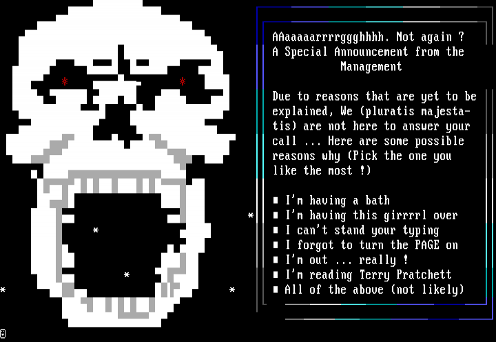 Due to reasons that are yet to be explained, We pluratis majesta- tis are not here to answer your call ... Here are some possible reasons why Pick the one you like the most ! Im having a bath * Im having this girrrrl over * I cant stand your typing I forgot to turn the PAGE on Im out ... really ! * Im reading Terry Pratchett * * All of the above not likely