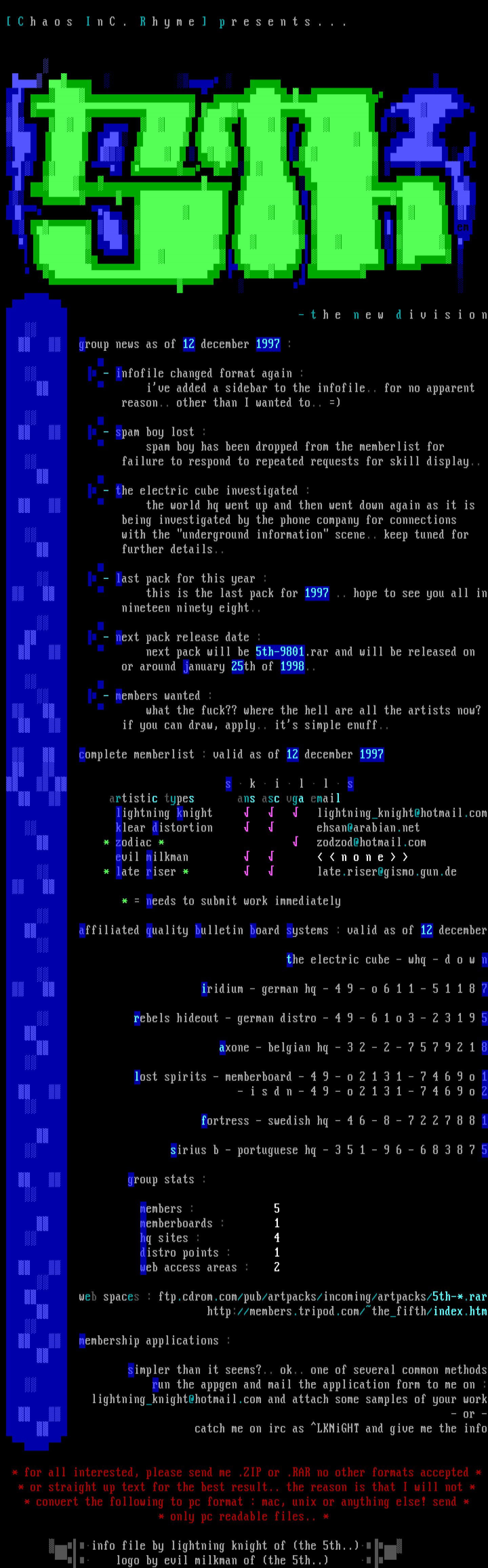 web spaces : ftp.cdrom.com/pub/artpacks/incoming/artpacks/5th-*.rar http://members.tripod.com/thefifth/index.htm