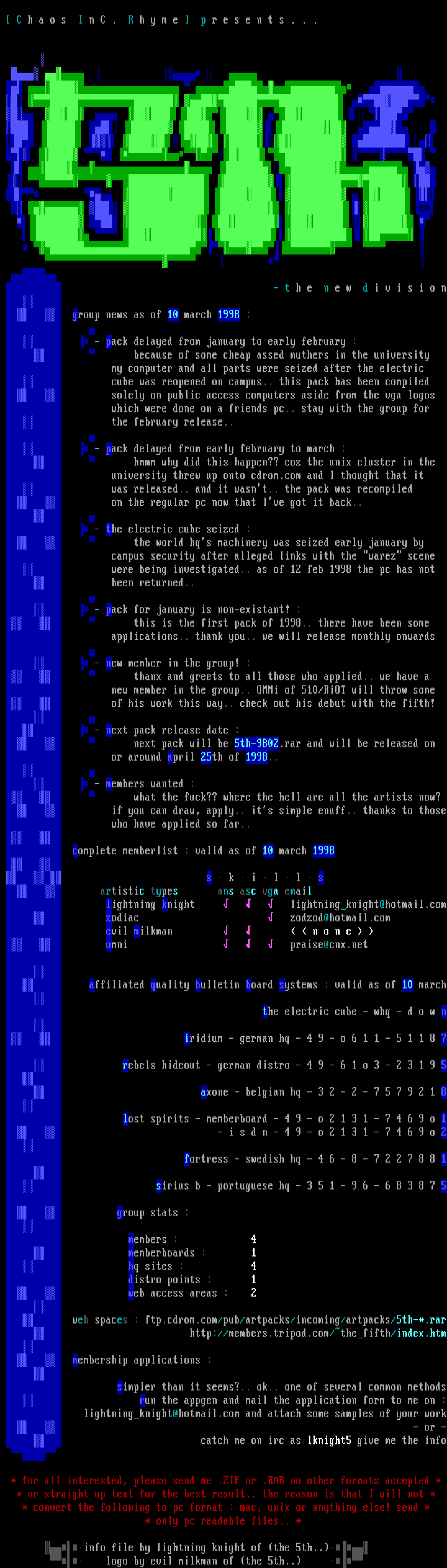 web spaces : ftp.cdrom.com/pub/artpacks/incoming/artpacks/5th-*.rar http://members.tripod.com/thefifth/index.htm
